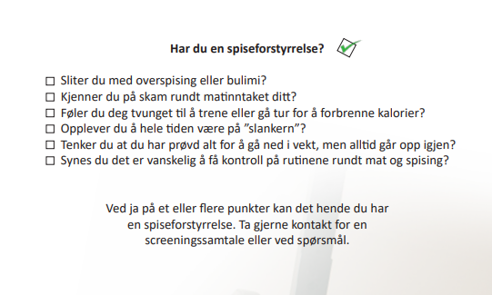Kurset er rettet mot personer med bulimia nervosa eller overspisingslidelse, og det er nok at du selv opplever utfordringer med mat og spising. Du trenger ikke henvisning fra lege for å delta. Felles for begge tilstandene er gjentatte episoder med overspising, det vil si inntak av store mengder mat over kort tid, ofte ledsaget av en følelse av tap av kontroll.