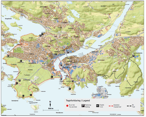 Hele kyststien er 8 km lang, og store deler av løypa er tilgjengelig med barnevogn og rullestol.